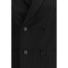 The pinstriped double-breasted Jacket by Alexander McQueen reimagines classic tailoring with a bold, contemporary edge. The fine stripe pattern is enhanced by a refined metallic pinstripe effect, adding graphic depth while preserving elegance. Classic lapels, a double-breasted button fastening, a chest pocket, and side welt pockets shape a sharply constructed silhouette. At the back, T-chain details introduce a distinctive, symbolic accent that reflects the house’s unmistakable identity. A statement piece designed for confident, sophisticated dressing with a strong sartorial attitude.