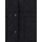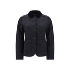 The Deveron Quilt Jacket by Barbour, classic velvet ribbed collar, snap button front closure, two slit patch pockets on front, iconic brand monogram embroidered on front, all-over quilted design, monochrome pattern, regular fit.
