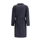 The Denim-effect Wool Carnia Coat by Max Mara brings a contemporary twist to the house’s timeless refinement. Crafted from hand-stitched, pure wool double fabric, it reflects the artisanal mastery that defines the brand. The robe-style silhouette, with its slightly egg-shaped volume, drapes naturally over the figure, while the lapel collar and dropped shoulders convey a sense of relaxed elegance. A matching belt discreetly defines the waist, completing a piece designed to elevate everyday gestures with understated sophistication.