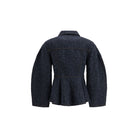 The tweed denim peplum Jacket by GANNI offers a refined take on classic denim through a textured tweed fabrication. Subtle fading and jacquard stripes run throughout the design, adding visual depth and character. A spread collar and front button closure finished with logo-enameled gold-tone hardware lend a polished touch, while flap chest pockets introduce a utilitarian note. The pleated peplum hem shapes the silhouette beautifully, giving the jacket a feminine yet modern edge.