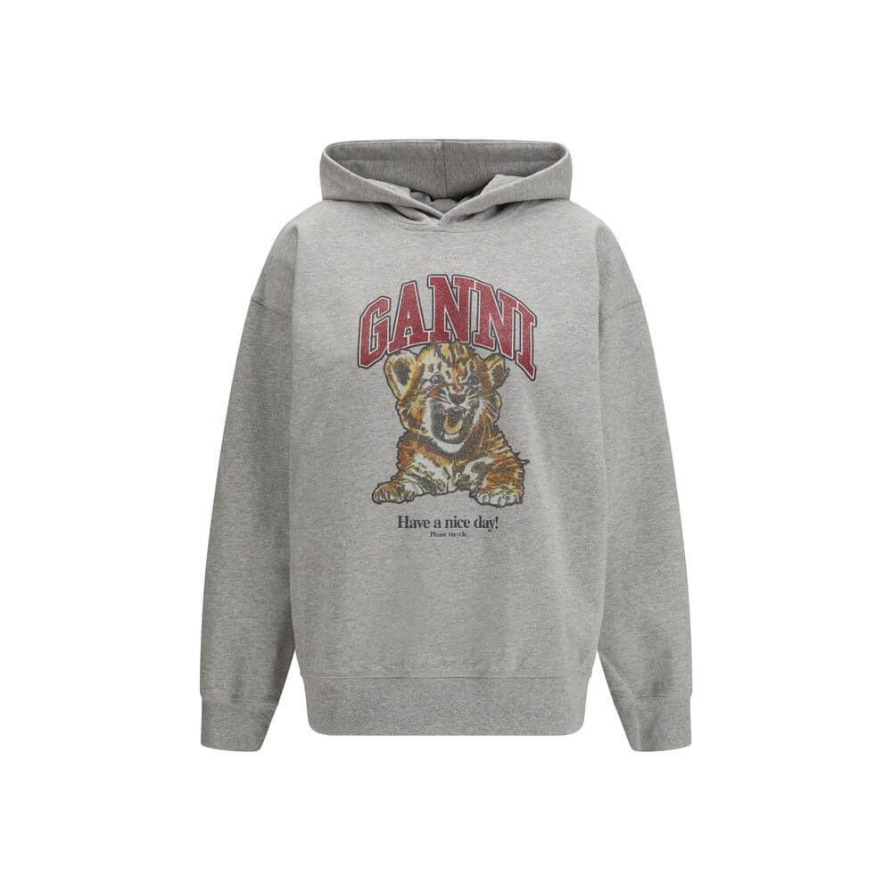 The Tiger Hoodie by Ganni is an urban and contemporary piece. The long sleeves and ribbed cuffs offer comfort and a perfect fit, while the tiger print graphic adds a bold and distinctive touch. The GANNI logo and the message “Have a nice day! Please recycle” convey a positive and sustainable message. Ideal for a casual and modern look, this sweatshirt is perfect for those seeking a unique style without sacrificing practicality.