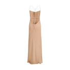 The long strass Slipdress by Pinko expresses a bold sense of femininity through a fluid and luminous silhouette. Designed with a slip-style construction, it features delicate shoulder straps and a softly draped front neckline that follows the body with ease. The back reveals a wide round opening, leaving the back exposed and defined only by two tie ribbons at the center. Crafted from matte georgette, the dress is embellished with all-over strass, turning the piece into a striking and unmistakable expression of the Pinko aesthetic.