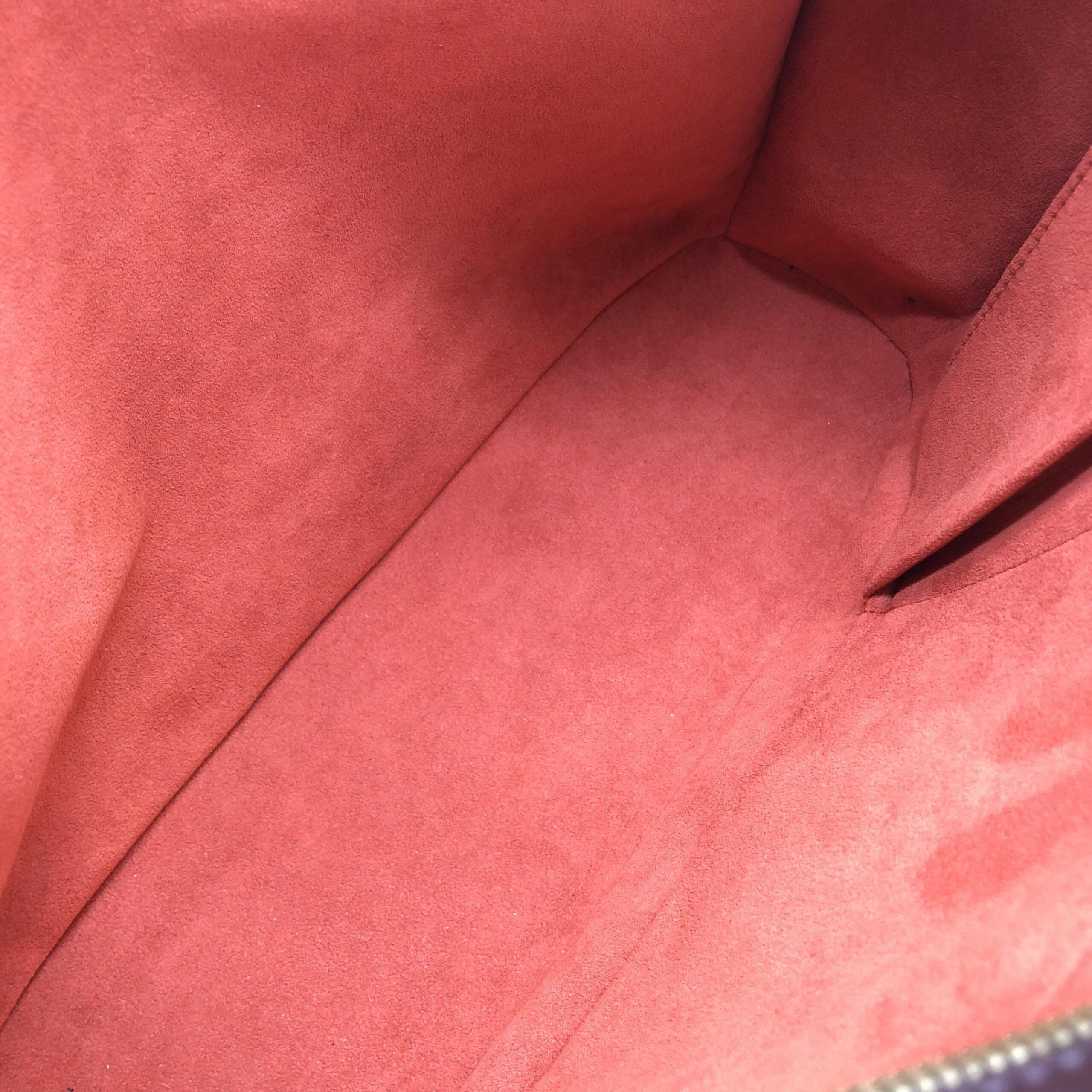 Inside, the bag reveals a well-maintained interior with minor wear throughout, providing ample space for your essentials while maintaining a sleek silhouette. The top handle design ensures comfortable carrying, making it a versatile addition to any wardrobe.