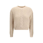 The cropped boxy Sweater by Max Mara Studio, crafted from a soft alpaca-blend yarn interwoven with metallic fibers for a touch of shine and character. The all-over cable and textured knit enrich the design, while the crew neck and dropped shoulders evoke a modern, effortless sophistication.