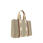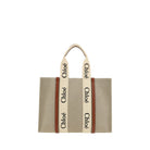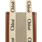 Linen Woody Handbag by Chloé, two flat top handles, appliqué handle extensions on bag panels, iconic brand monogram printed in contrast on handles, interior flat pocket, leather trim.