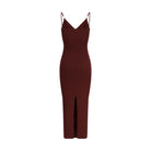 The Safety Pin Slip Midi Dress by Versace features a fitted line crafted from stretch viscose knit, offering a controlled, body-skimming elasticity. The V-neckline is cleanly defined, while the ribbed texture adds structure and maintains a streamlined appearance. The Safety Pin detail and the Medusa Head motif introduce the house’s signature elements with subtle precision. A rear slit allows ease of movement, completing a silhouette designed for modern, effortless elegance.