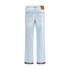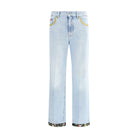 The Valentino Floral edge Jeans combine the classic five-pocket straight cut with refined and original details. The front zip and button fastening, belt loops and polka dots on the pockets add practicality and style, while the edges decorated with floral motifs give a romantic and distinctive touch.