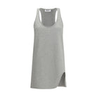 Sleeveless tank-style mini dress By The Attico, featuring a clean, modern silhouette. The crew neckline is finished with ribbed edges for added structure. The design is elevated by a distinctive side cut-out on the lower left side, giving the piece a dynamic, bold touch.