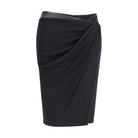 Versace’s Draped jersey Skirt by Versace is a sophisticated, flowing piece featuring an elegant front drape that enhances the silhouette. The asymmetric hemline adds a modern and dynamic touch, making this skirt perfect for chic and contemporary looks.