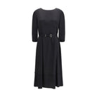 The wool and silk midi Dress by Prada is a sophisticated and modern garment, made from a fine combination of wool and silk that offers comfort and refinement. The round neckline and long sleeves give it an elegant look, while the technical nylon belt at the waist adds a touch of modernity and structure. The button closure at the back completes the design with a chic and functional detail. Perfect for a versatile look that combines elegance and comfort.