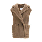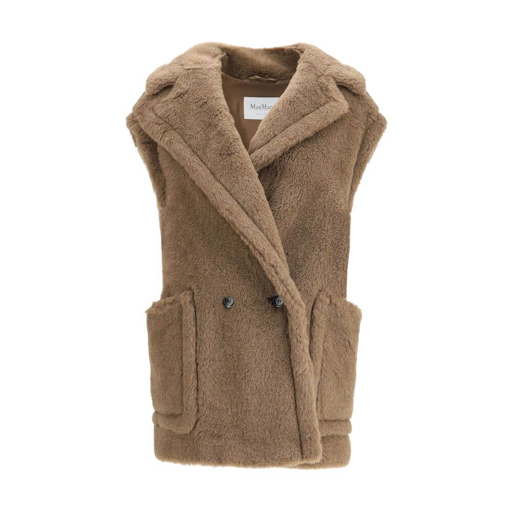 The Teddy alpaca and wool Vest by Max Mara reinterprets the maison’s iconic fabric in a contemporary sleeveless version. Oversized in volume, it is crafted from alpaca and wool on a silk base, enhanced by a maxi lapel collar and a double-breasted front with two visible buttons. Large patch pockets add a functional yet refined touch, while the stretch jacquard Monogram lining underscores the brand’s dedication to luxurious detail.