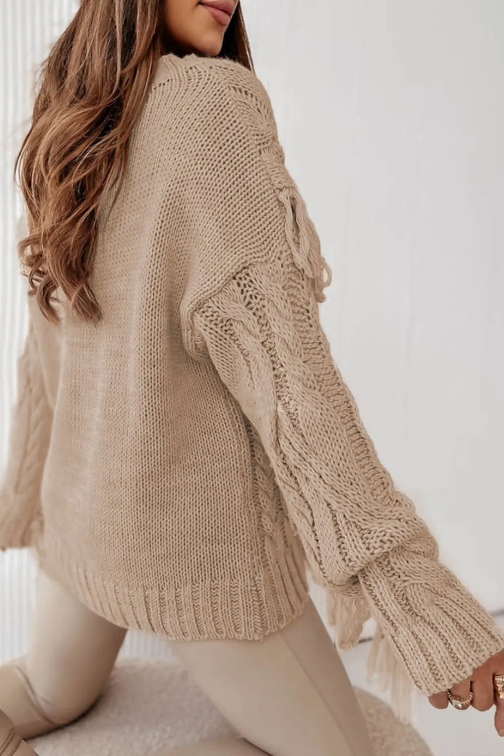 Cable Knit Fringe Round Neck Long Sleeve Sweater