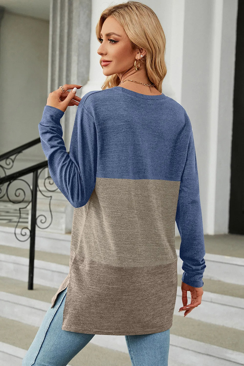 Color Block Round Neck Long Sleeve T-Shirt