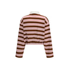 The long-sleeve T-shirt in filo di Scozia cotton by Prada features a hybrid design inspired by retro sportswear, highlighted by a baiadera stripe print. Designed with an oversized fit, it is finished with a shirt-style collar, long sleeves, and a front patch pocket with a tailored logo label, adding a distinctive signature touch. A contemporary piece that blends comfort with Prada’s modern reinterpretation of classic codes.