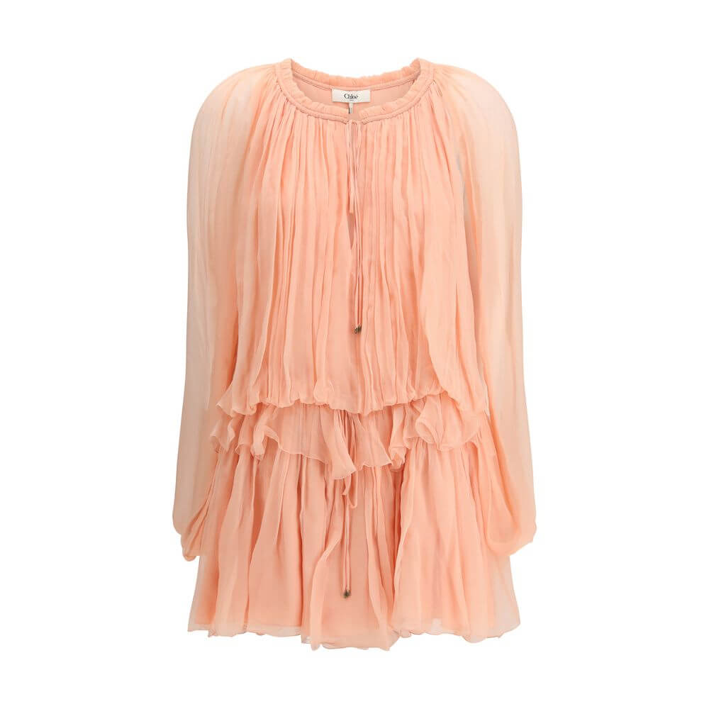 The mini Dress with cape in silk muslin by Chloé is crafted from the house’s iconic organic silk and features a gathered silhouette enriched with ruffles and drawstrings finished with Gold-tone metal tips. The design includes a back zipper, adjustable drawstrings at the waist and neckline with hammered details, and a separate lining that enhances the garment’s airy structure. The organic silk used for this piece minimizes chemical usage, preserves biodiversity, improves soil quality, and reduces water consumption. The dress is produced in partnership with Akanjo, a WFTO-certified supplier in Madagascar and a long-standing Chloé partner dedicated to fair wages, worker well-being, and the preservation of artisanal craftsmanship.