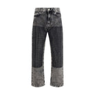 The Pinko five-pocket jeans in black stone-washed denim feature a loose-fit, contrast patches, and small faceted studs, with mid-rise waist, belt loops, and zip and button closure, combining workwear style with contemporary details.