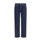 The Farley Jeans by Khaite are inspired by the 90s, offering a straight-leg silhouette that adds a touch of practicality to rigid denim. The mid-rise cut, which sits just below the navel, features square, slim lines for a modern and sophisticated shape. Each pair is finished by hand and features an antique nickel button, adding a high-quality, unique detail to the garment. Perfect for those looking for a classic look with a contemporary twist.