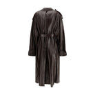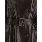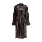 The Bairo long trench Coat by Sportmax reimagines a classic outerwear icon with a modern glossy finish. Crafted from coated brown fabric, it features a shirt collar with throat latch, visible side button closure, and military-inspired details such as shoulder and cuff epaulettes. A covered-buckle belt defines the waist, while the relaxed, fluid silhouette enhances movement, embodying a refined yet confident sense of style.
