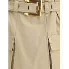Balmain’s cargo Miniskirt reinterprets utility style with a sophisticated twist. Featuring a removable belt with a PB engraved gold metal Anthem buckle, it has two side pockets with gussets and a flap. The back closure with exposed zipper and Balmain engraved slider adds a bold iconic detail to the design.
