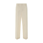 Cotton Pants by Miu Miu, front button and zipper closure, two side slash pockets, two welt pockets at back, waistband loops, iconic embroidered brand signature patch at back.