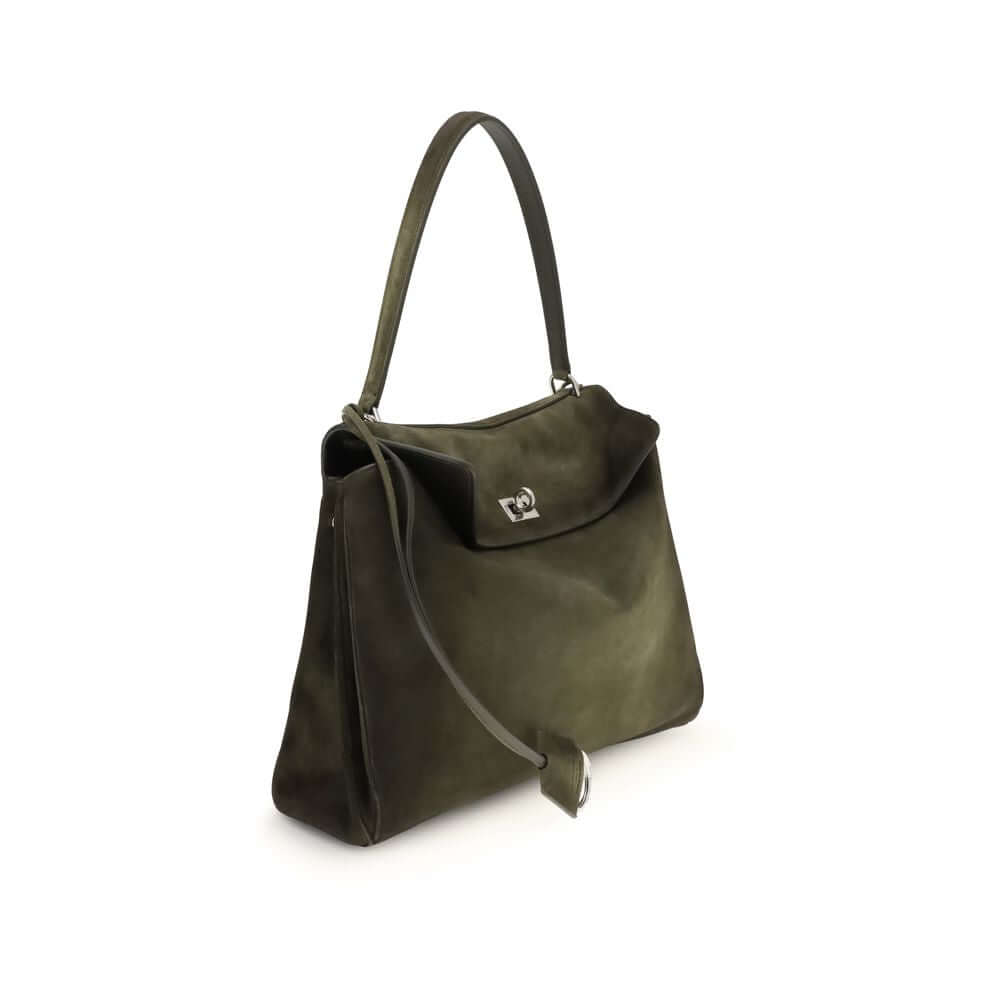 The Medium Rodeo Bag by Balenciaga blends sophistication and practicality with its combination of waxed suede calfskin and smooth leather. It features a top handle and a detachable shoulder strap for versatile carry.Functional details include a spacious front pocket, two flat back pockets, and an interior zip pocket. The turn-lock closure, removable keychain with double spiral ring, and antique silver hardware add signature character.