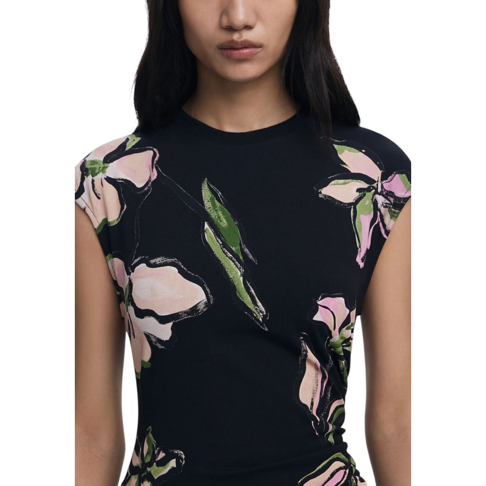 The Desigual VEST_KATRINA 25WWVK12 women’s long dress embodies contemporary elegance. Made from a comfortable fabric consisting of 96% cotton and 4% elastane, this dress offers a soft, slightly stretchy fit that enhances the silhouette without restricting movement. The asymmetric hem design adds flow and originality, while the stylized floral print brings an artistic and feminine touch. With short sleeves and a crew neckline, it is versatile—ideal for both formal occasions and evening events or spring and summer ceremonies. The tailoring details and Desigual’s renowned quality are evident in every aspect, making this dress a unique and distinctive addition to any woman’s wardrobe.