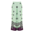 Gucci Print Silk Palazzo Pants. In aqua green and purple, with contrasting polka dots and flower print. Side zip opening, no button, two side welt pockets, wide leg.