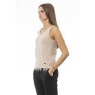 Elevate your wardrobe with the Baldinini Trend’s exquisite V-neck tank top, where sophistication meets edgy flair. Perfectly trimmed with delicate feathers, this piece boasts fine ribbed knit at the neck and hem for that touch of finesse. Adorned with the signature Baldinini Trend metal monogram, it imbues luxury in every thread. Crafted from a sumptuous blend of wool, viscose, cashmere, and nylon, and hailing from Italy, this beige top is a statement of chic elegance.