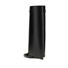 The leather Shark Boots combine boldness and sophistication. With a distinctive Shark line, they feature a metal clip engraved with “GIVENCHY” and gold-finish metal details that enhance the design. The straight cut offers a versatile and comfortable fit, while the pointed toe and covered wedge add a touch of elegance. Perfect for those looking for a boot that combines style and practicality, ideal for completing sophisticated and modern looks.
