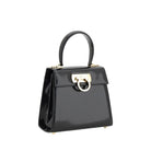 The Iconic leather Handbag by Ferragamo is a high-class piece that combines elegance and functionality. The refined geometric design is accentuated by the flap closure on the front and the Gancini plaque in gold metal, the brand’s unmistakable symbol. The top handle allows for comfortable carry by hand, while the metal feet at the base protect the bag and preserve its shape. Made of patent leather, this bag has a polished and sophisticated look. Inside, the single compartment offers enough room for essentials, making it perfect for a stylish and practical look.