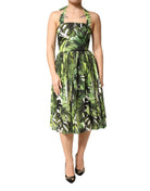 Green Leaves Print Cotton Halter Midi Dress